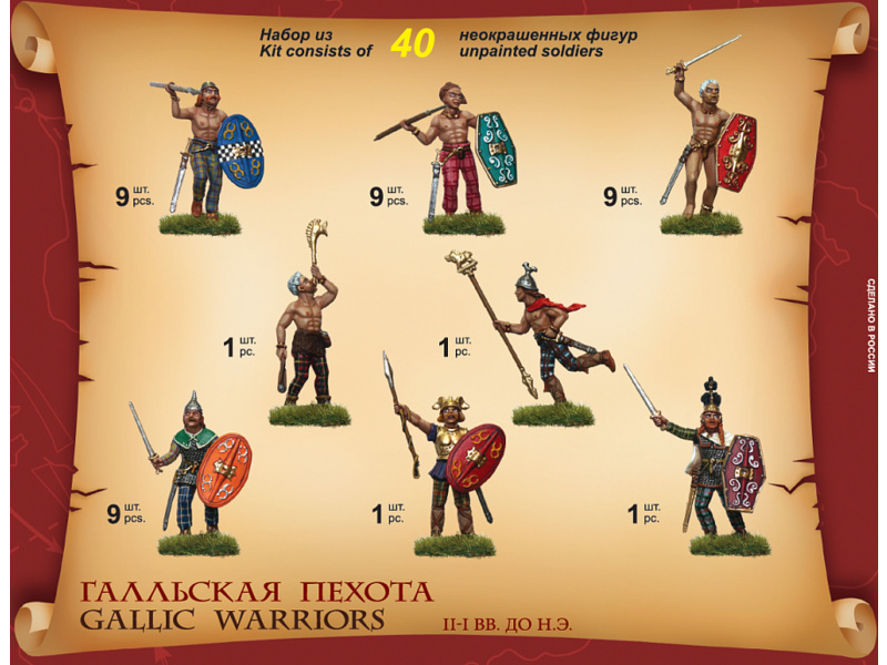 Sada doplňující plastikové modely Zvezda 8012 - figurky galských válečníků v měřítku 1:72. Stavebnice obsahuje 40 dílků.