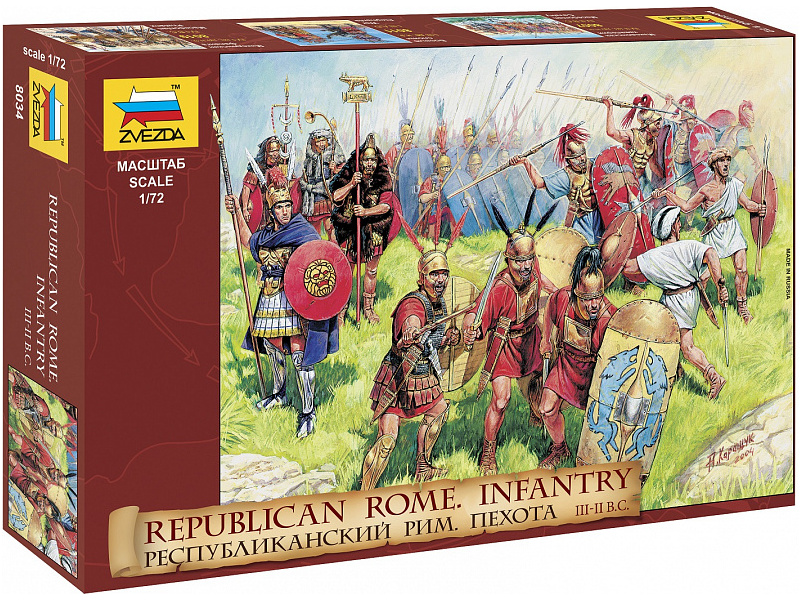 Plastikový model Zvezda 8034 - figurky republikánské římské pěchoty III-II BB. PŘED NAŠÍM LETOPOČTEM v měřítku 1:72. Stavebnice obsahuje 40 dílků, výška figurky 24 mm. Ideální pro doplnění plastikových modelů či diorámat.