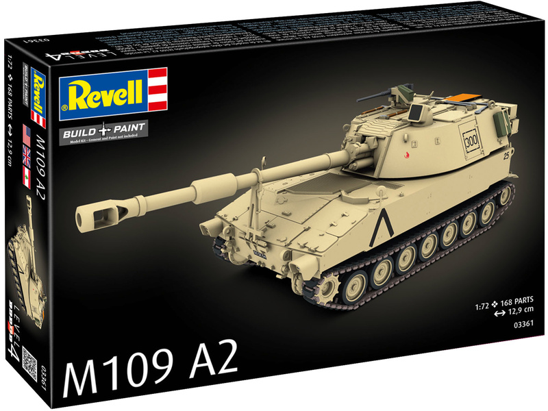 Plastikový model Revell 03361 - M109 A2 v měřítku 1:72 ke slepení. Stavebnice obsahuje 168 dílků, délka 12.9 cm, obtížnost 4.