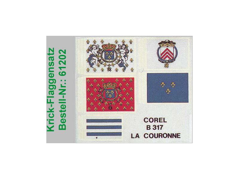 Maketové doplňky pro modely lodí Krick: Sada vlajek La Couronne. Vlajka červená/zlatá/modrá 54 x 40 mm, vlajkový anděl bílá/červená/zlatá 54 x 40 mm, vlajka modro/bíle pruhovaná 40 x 28 mm, vlajka modrá/zlatá 48 x 35 mm, vlajka bílá/modrá/červená/zlatá 48 x 35 mm