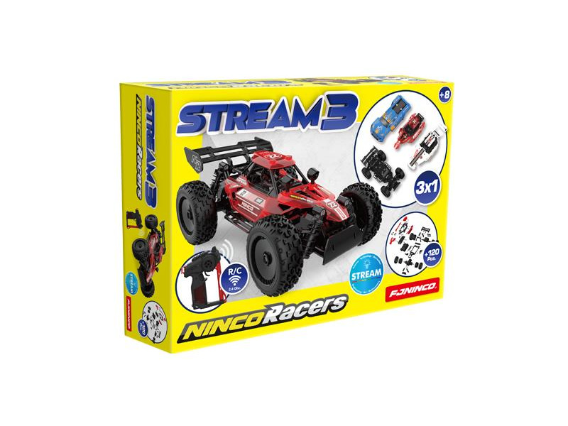 Stavebnice auta na dálkové ovládání NINCORACERS Stream 3 in 1. Naučte děti jak funguje mechanika s autíčkem, které sestaví z více než 120 dílů. Stavba je přitom jednoduchá a není potřeba nářadí. Na výběr jsou 3 karoserie. Provoz auta je na tužkové baterie. Vysílač 2.4 GHz. Rychlost až 8 km/h.