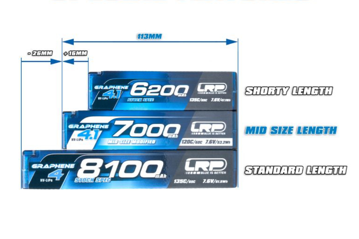 Nejnovější generace baterii LRP z roku 2024. "GRAPHENE 4.1" technologie znamená, že baterie jsou lehčí, odolnější pro skladování, s kratší dobou nabíjení, s vyšším výkonem s menším elektrickým odporem mezi články, tzn. i s delší životností.