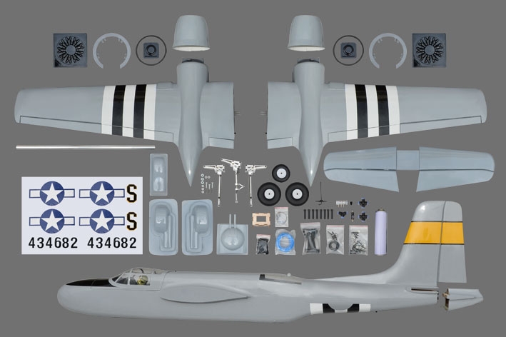 Stavebnice obsahuje: nažehlovací fólií potažený trup, křídlo a ocasní plochy, nastříkané laminátové motorové kryty, 2 plastová motorová lože pro spalovací motory, sadu drobného příslušenství, pneumatický zatahovací podvozek s odpruženými nohami, kola a podrobný obrázkový návod.