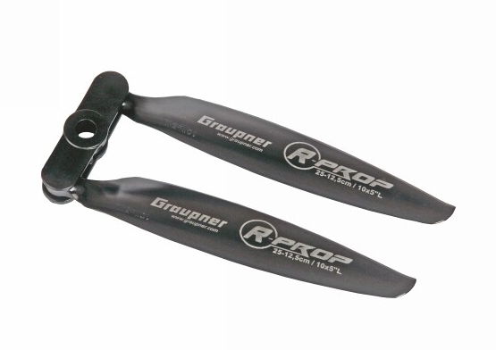 Levotočivá dvoulistá sklopná plastová vrtule plněná skelnými vlákny, rozměr a stoupání 10/5 palců, 25/12,5mm, vrtání 5 a 6mm, váha 13 g.