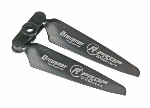 Pravotočivá dvoulistá sklopná plastová vrtule plněná skelnými vlákny, rozměr a stoupání 9/5 palců, 23/12,5mm, vrtání 5 a 6mm, váha 10 g.