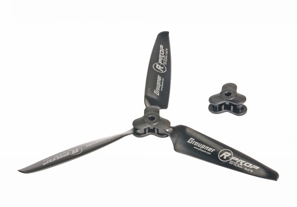 Pravotočivá třílistá sklopná plastová vrtule plněná skelnými vlákny, rozměr a stoupání 9/5 palců, 23/12,5mm, balení obsahuje dva unašeče o průměru 5 a 6mm, váha 14 g.