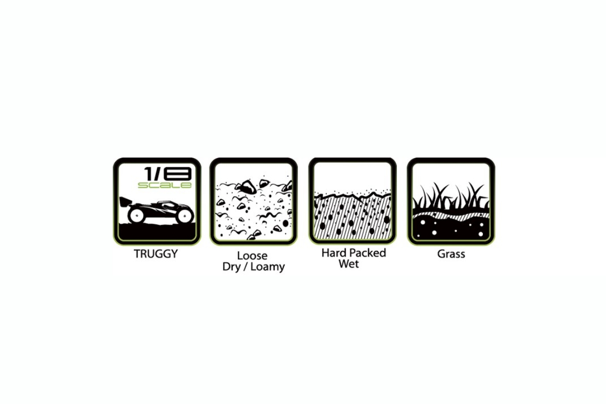 Kompletní kola pro truggy 1/8. Pneumatiky vhodné do sucha i do mokra, pro tvrdou i prašnou hlínu a podobné povrchy, včetně trávy. Disky pro 17mm hex unašeče.