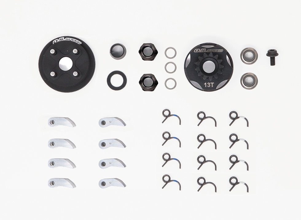 Čtyřdílná spojka vyvinutá pro 1/8 OFF-ROAD podvozky. Kombinace dvou typů spojkových čelistí, matic setrvačníku a tří typů pružin spojky umožňuje jemné nastavení podle rozložení a podmínek povrchu dráhy. Ve srovnání s běžnou třídílnou spojkou je spínaní spojky plynulejší a má výhodu, pokud jde o účinnost paliva.