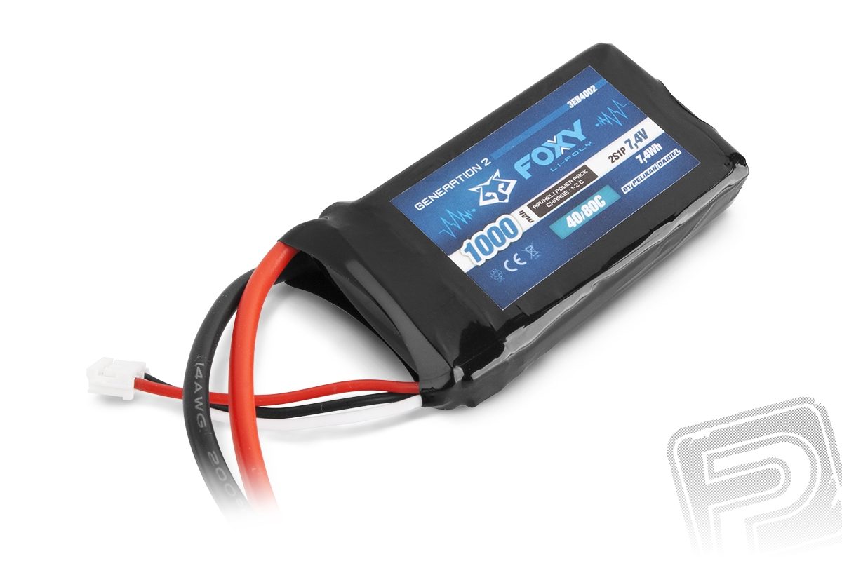 LC Li-poly akumulátorová sada FOXY druhé generace (verze2014) se zvýšenou zatížitelností 40/80C, nabíjení až 2C. Dvoučlánek 2s1p 7,4V 1000 mAh, servisní konektor JST-EH.