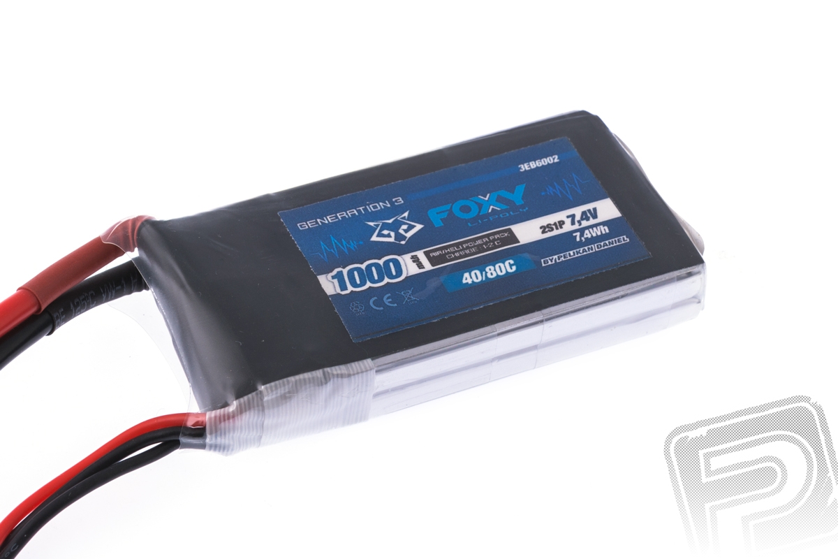 Li-poly akumulátorová sada FOXY 3. generace (verze2018) se zvýšenou zatížitelností 40/80C, nabíjení až 2C. Dvoučlánek 2s1p 7,4V 1000 mAh, rozměry: 72x36x12.5mm, hmotnost: 63g, servisní konektor JST-EH.