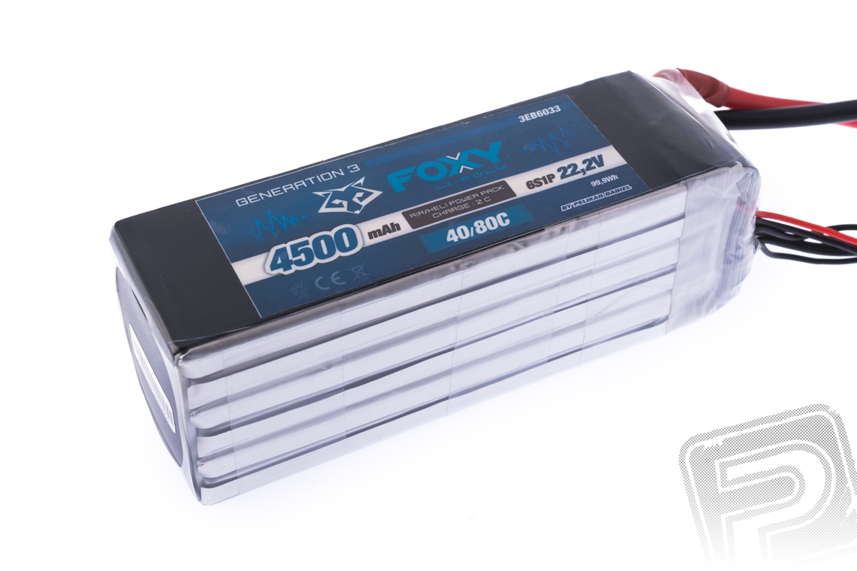 Li-poly akumulátorová sada FOXY 3. generace (verze2018) se zvýšenou zatížitelností 40/80C, nabíjení až 2C. Šestičlánek 6s1p 22,2V 4500 mAh, rozměry: 140x43x49mm, hmotnost: 620g, servisní konektor JST-EH.