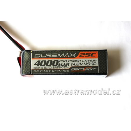 Letecká LiPol baterie DUREMAX nové generace 4000 mAh 14.8 V 25C/100 A pro RC modely letadel a vrtulníků. Silový konektor EC3, servisní JST-XH. Rozměry 35 x 40 x 135 mm. Hmotnost: 405 g.