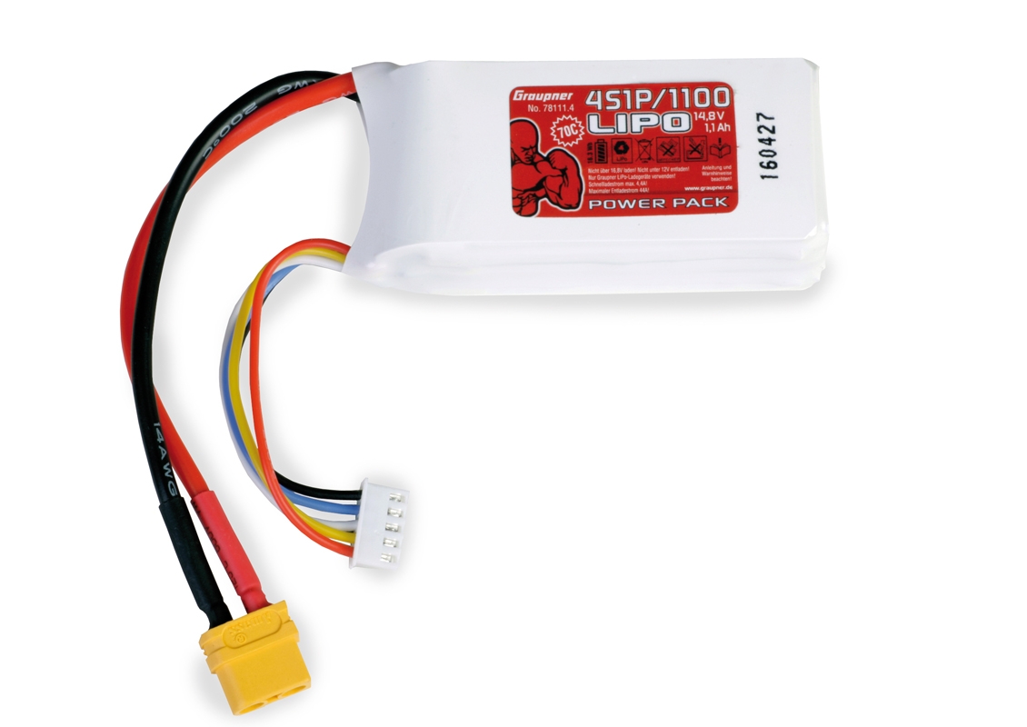 Li-poly akumulátorová sada se zvýšenou zatížitelností 70C, nabíjení až 4C. Čtyřčlánek 4s1p 14,8V 1100 mAh, konektor XT60, servisní konektor JST-XH.