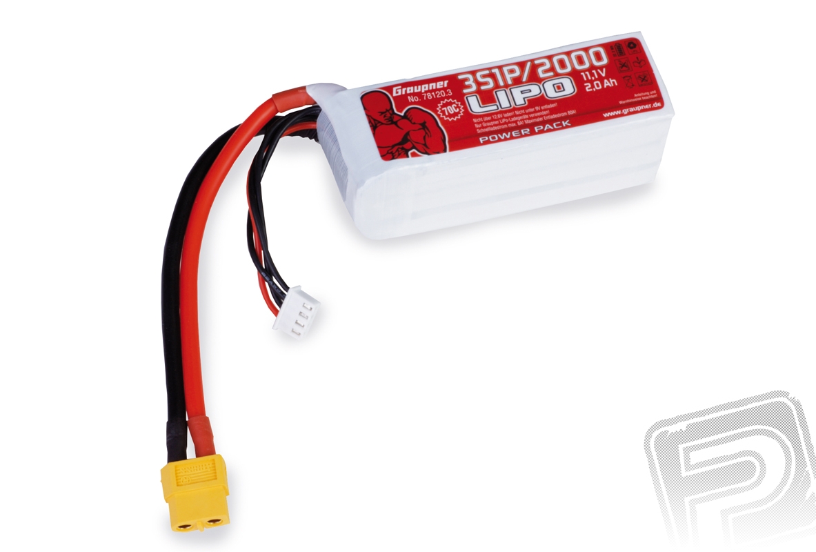Li-poly akumulátorová sada se zvýšenou zatížitelností 70C, nabíjení až 4C. Tříčlánek 3s1p 11,1 V 2000 mAh, konektor XT60, servisní konektor JST-XH.