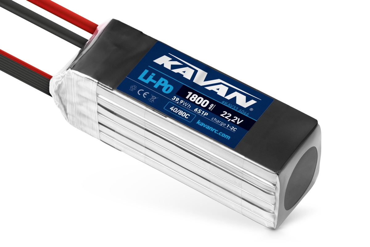 LiPo akumulátorová sada KAVAN se zvýšenou zatížitelností 40/80C, nabíjení až 2C. Šestičlánek 6s1p 22,2V 1800 mAh, rozměry: 94x35x41mm, hmotnost: 268g, servisní konektor JST-XH.