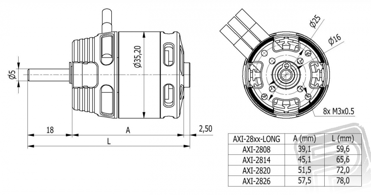 Nová generace motorů AXI 2820/xx V2 má vyšší výkon díky svému propracovanému designu, který ve spojení s integrovaným chladícím systémem na principu turbínového efektu proudění vzduchu udržuje vinutí motoru chladnější až o 20%. Speciální verze „Long“ je opatřena prodlouženým kónickým předním čelem pro snadnou montáž do trupů větroňů o malém průměru přídě.