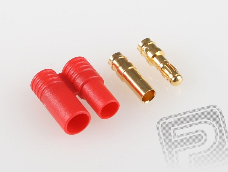 Silový zlacený konektor 3,5 mm s pružinovým kolíčkem se zatížitelností max. 50A (dlouhodobě 25A). Pro kabely o průřezu max. 2,1 mm2 (14AWG). Přechodový odpor 0,45 mOhm, max. 500 V. Balení 1 párů kolíček/dutinka s plastovým pouzdrem.