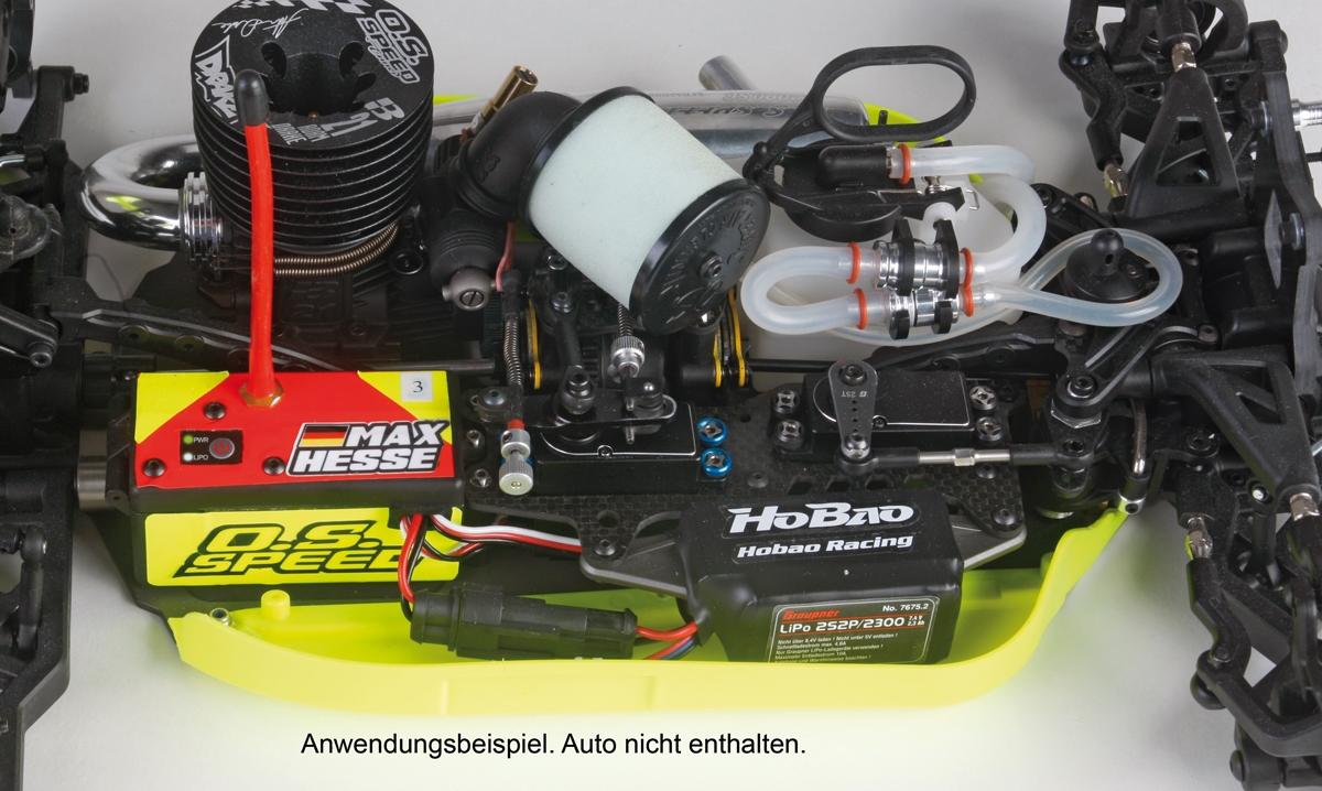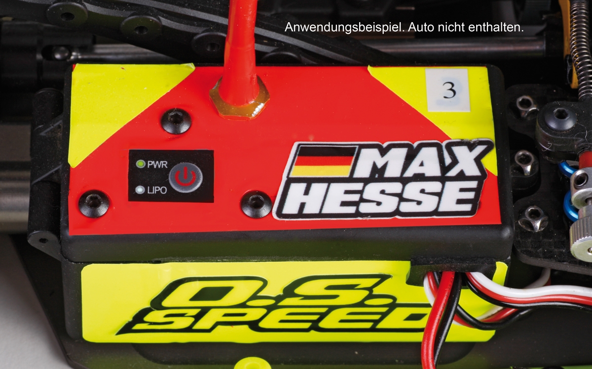 Vypínač je uzavřen v plastovém pouzdru, dodávaném s 2 výměnnými zadními víčky – jedno má 3 montážní patky pro upevnění na držák transponderu („čipu“ pro počítání kol); druhé víčko bez patek použijete pro upevnění do modelu pomocí oboustranné lepící pásky. Napájecí zásuvka je univerzální, umožňující připojení akumulátorů se servokonektory Futaba (s výstupkem na boku) i Hitec/JR (bez výstupku). Výstupní servokonektor je Hitec/JR.