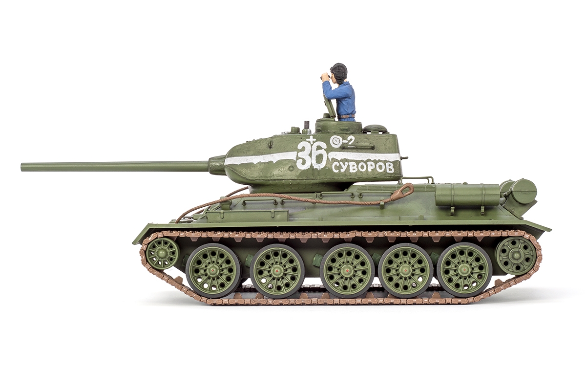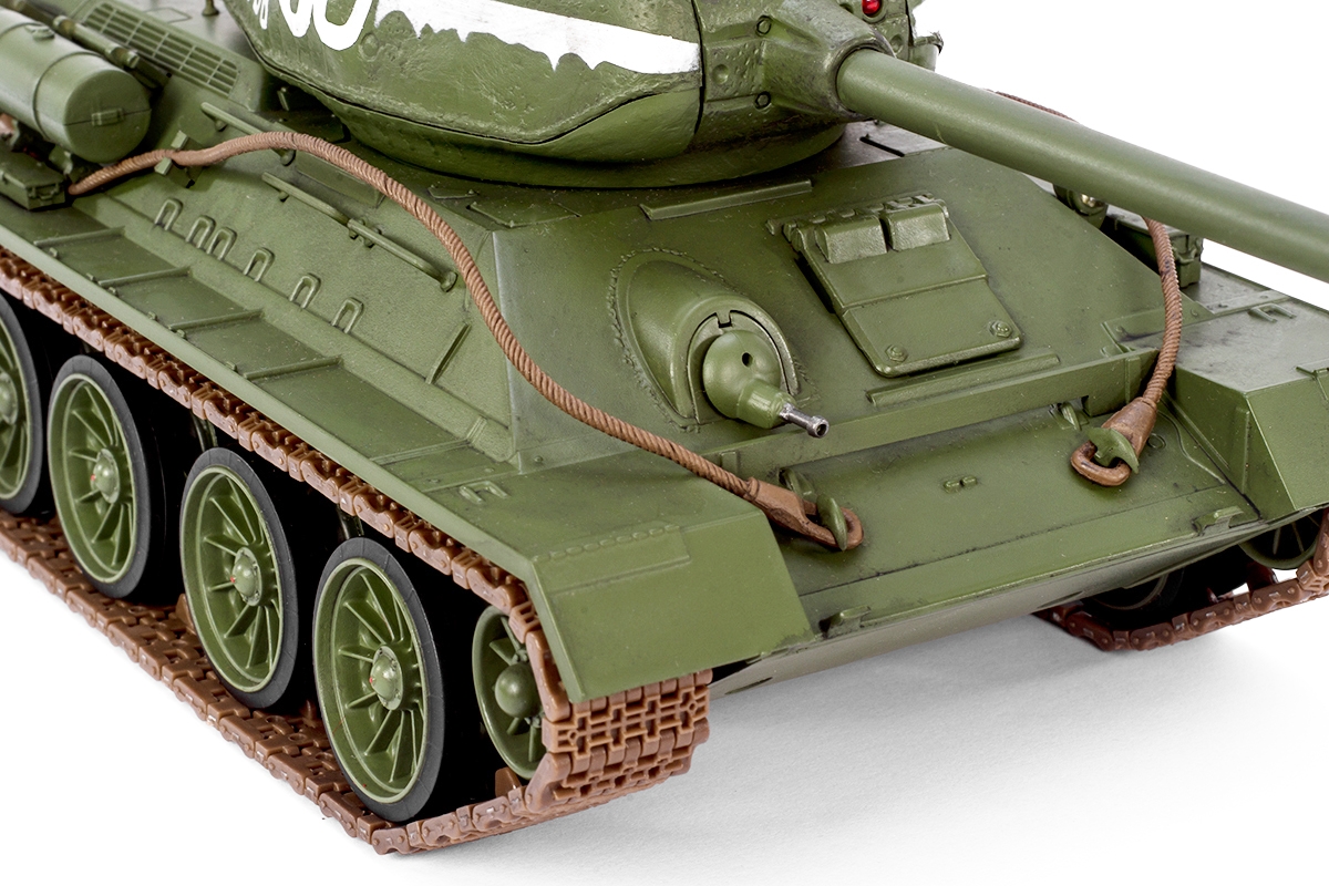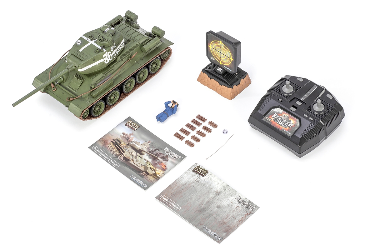 RC model T-34/85 v měřítku 1:24 s elektrickým pohonem věrně provádí většinu funkcí skutečného tanku. Je vybaven realistickým podvozkem s funkčními pásy, hnacími, odpruženými pojezdovými a napínacími koly, které umožňují jízdu vpřed i vzad, zatáčení vlevo a vpravo při jízdě vpřed i vzad. Nechybí ryze tanková „vychytávka" - otáčení na místě pomocí protiběžného pohybu pásů. Dálkově je ovládáno i otáčení věže (v úhlu 320o) a náměr děla (spouštění a zvedání hlavně). Kanón sice nevystřeluje protipancéřové nebo tříštivé projektily, ale svého protivníka dovede pořádně pocuchat infračervenými paprsky – detekci zásahů zajišťuje senzor umístěný na horní straně věže; zásahy signalizuje LED na čelním štítu děla. Pro nácvik střelby je s modelem dodáván elektronický terč se stojánkem, který každý zásah doprovodí zvukovým efektem výbuchu.