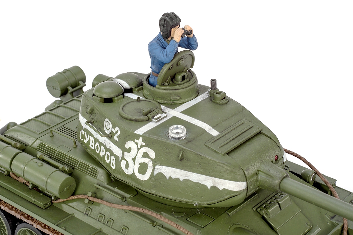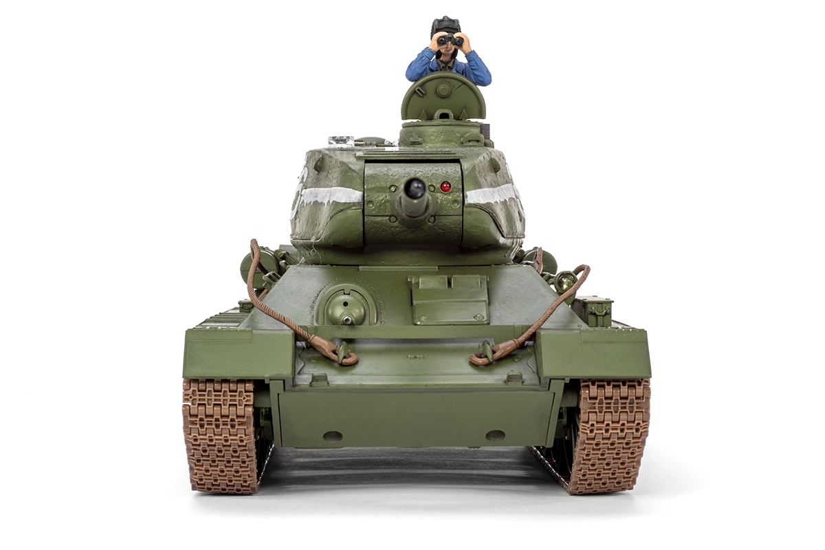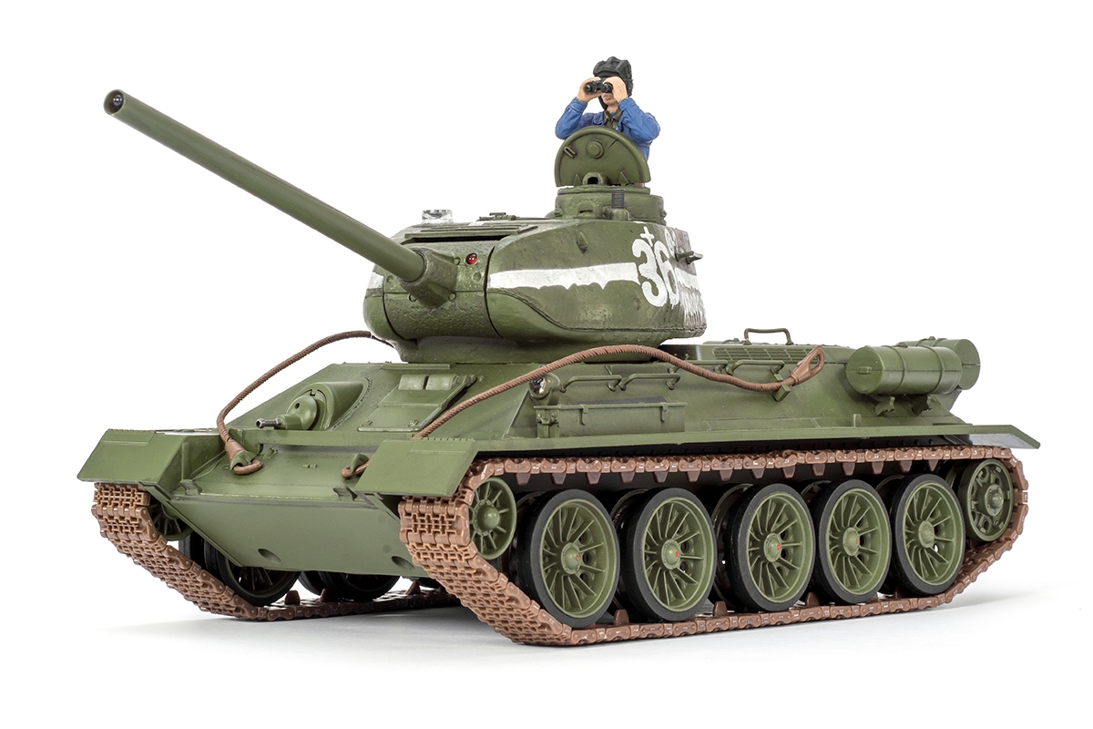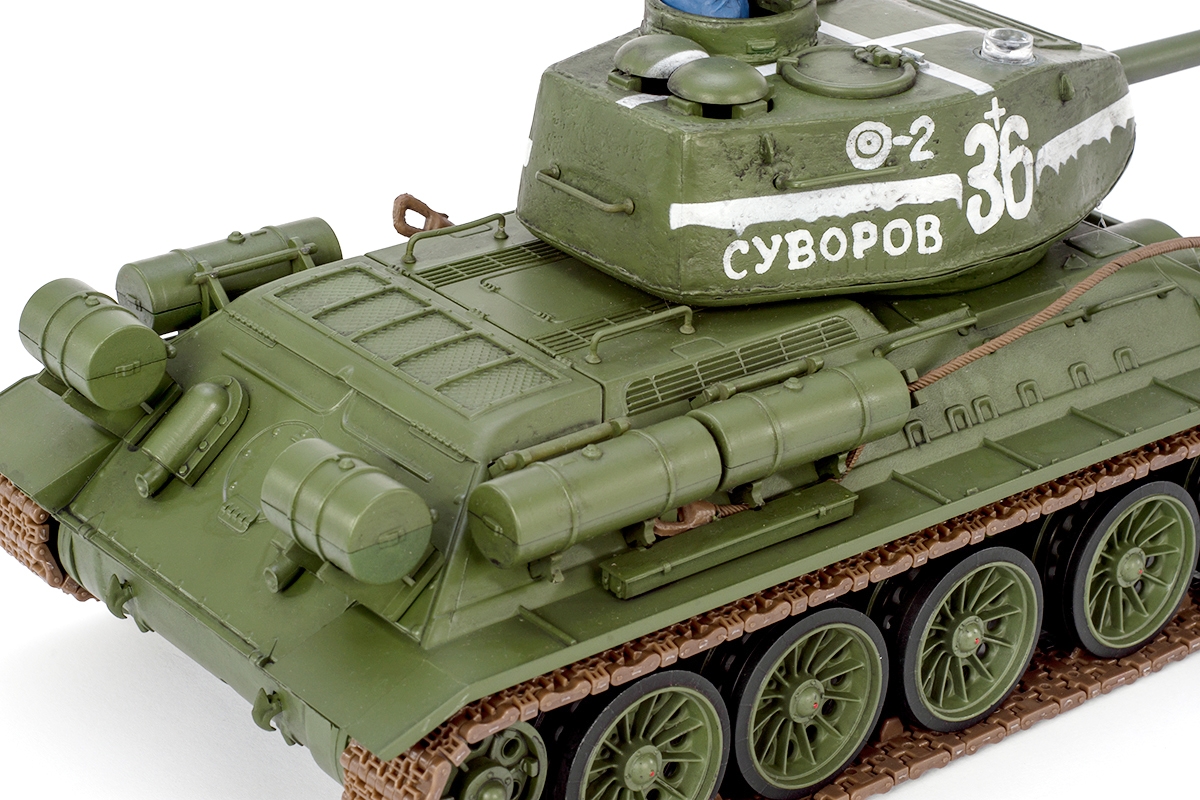 RC model T-34/85 v měřítku 1:24 s elektrickým pohonem věrně provádí většinu funkcí skutečného tanku. Je vybaven realistickým podvozkem s funkčními pásy, hnacími, odpruženými pojezdovými a napínacími koly, které umožňují jízdu vpřed i vzad, zatáčení vlevo a vpravo při jízdě vpřed i vzad. Nechybí ryze tanková „vychytávka" - otáčení na místě pomocí protiběžného pohybu pásů. Dálkově je ovládáno i otáčení věže (v úhlu 320o) a náměr děla (spouštění a zvedání hlavně). Kanón sice nevystřeluje protipancéřové nebo tříštivé projektily, ale svého protivníka dovede pořádně pocuchat infračervenými paprsky – detekci zásahů zajišťuje senzor umístěný na horní straně věže; zásahy signalizuje LED na čelním štítu děla. Pro nácvik střelby je s modelem dodáván elektronický terč se stojánkem, který každý zásah doprovodí zvukovým efektem výbuchu.