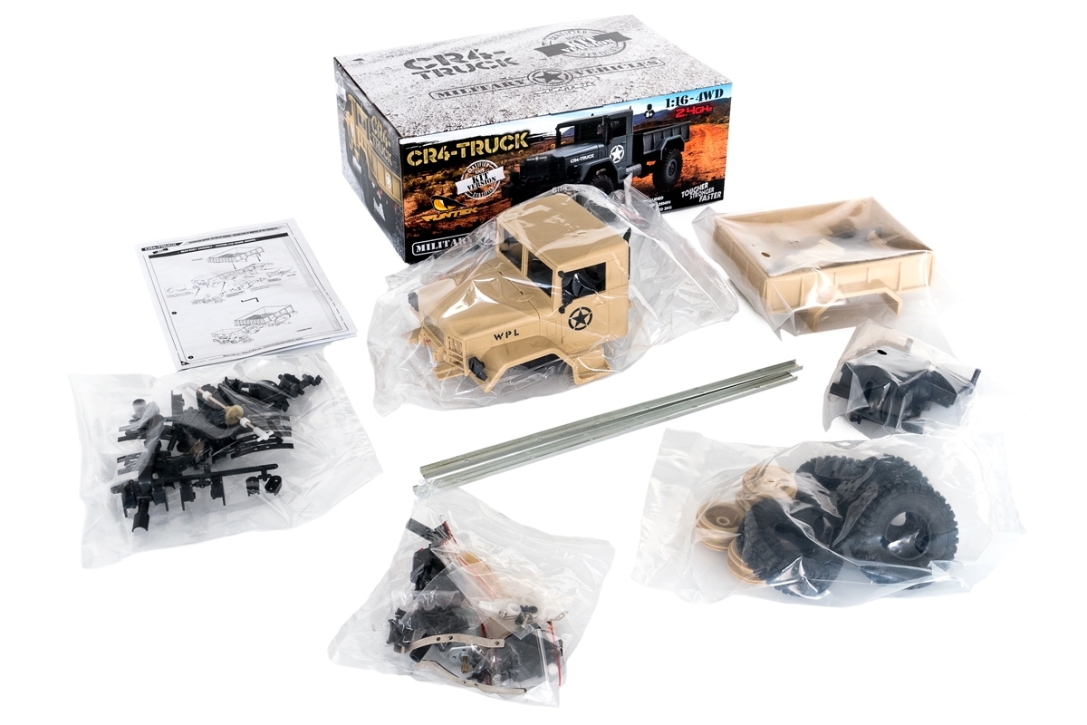 CR4 je dálkově ovládaný nákladní vůz v čistě vojenském stylu. Toto vozidlo v měřítku 1/16 se nebojí skutečného terénu. Do korby je možné naložit a vézt náklad o hmotnosti až 0,6kg! Stavebnice je perfektně připravená pro finální sestavení nákladního vozu, který zaujme pěknou karoserii s mnoha detaily (světlomety, zadní světla, zrcátka, spony, navijáky, gumové pneumatiky s terénním vzorkem).
