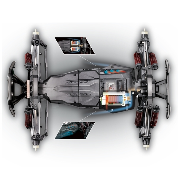 Pohon všech kol (4WD) funguje velmi efektivně a zajišťuje max. zábavu v jakémkoliv terénu a povrchu. Auto je kompletně osazeno kuličkovými ložisky a kovovými hnacími nápravami s nezávislým zavěšením, což v kombinaci s proporcionálním dálkovým ovládáním 2,4 GHz má působivý a úchvatný výkon.