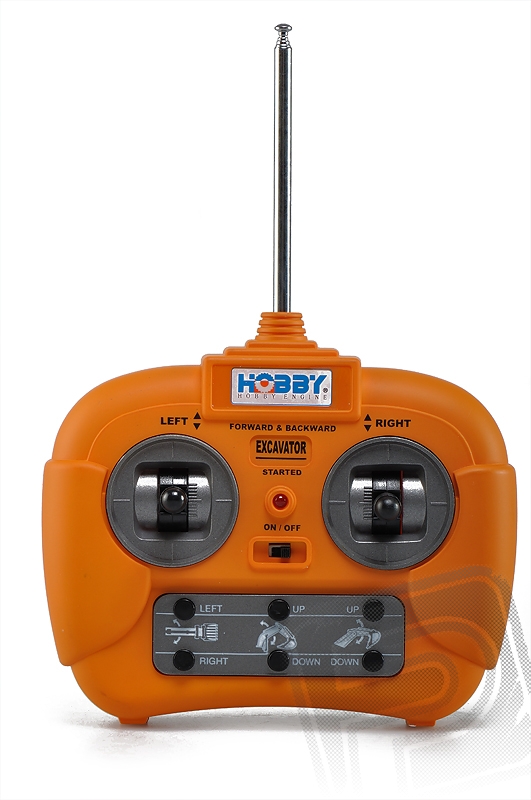 Vysílač dodávaný s modelem má dva pákové ovladače ovládající pojezd modelu podobně jako "rajčáky" u skutečnho bagru na pásovém podvozku: sočasným vychýlením vpřed jede bagr přímo vpřed, současným vychýlením vzad bagr couvá. Pokud např. levou páku vychýlíte vpřed zatímco pravou ponecháte v neutrálu, bagr zatáčí doprava (levý pás se pohybuje rychleji). Pokud vychýlíte jednu páku vpřed a druhou vzad, bagr se díky protiběžnému pohybu pásů otáčí na místě. Další funkce jsou ovládány tlačítky: dvě tlačítka ovládají otáčení plošiny bagru vpravo nebo vlevo, dvě další ovládají prostřední část ramene a poslední dvě koncovou část ramene se lžící. Všechny mechanismy jsou proti přetížení a pohybu za mechanický limit chráněny třecími spojkami - pokud se pohyb zastaví, a vy uslyšíte cvakavý zvuk, dosáhli jste maximální meze pohybu v daném směru.