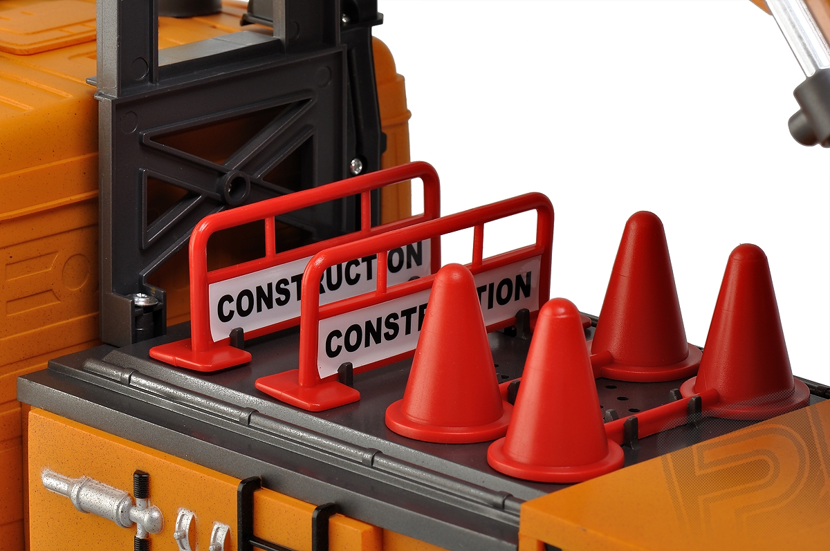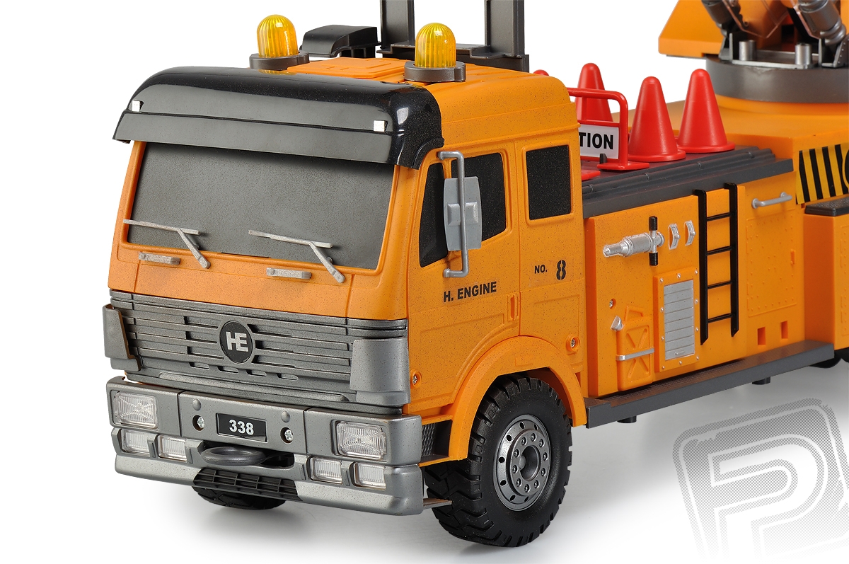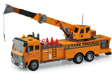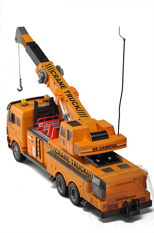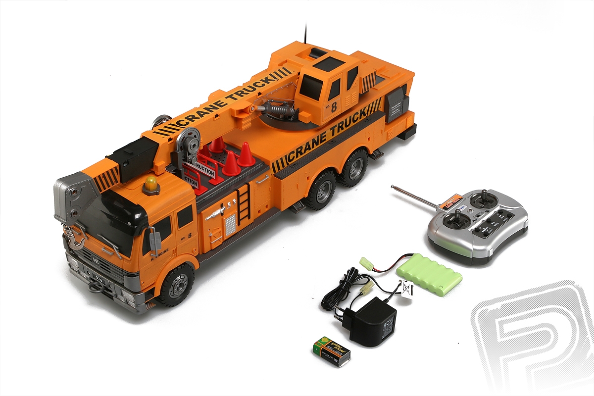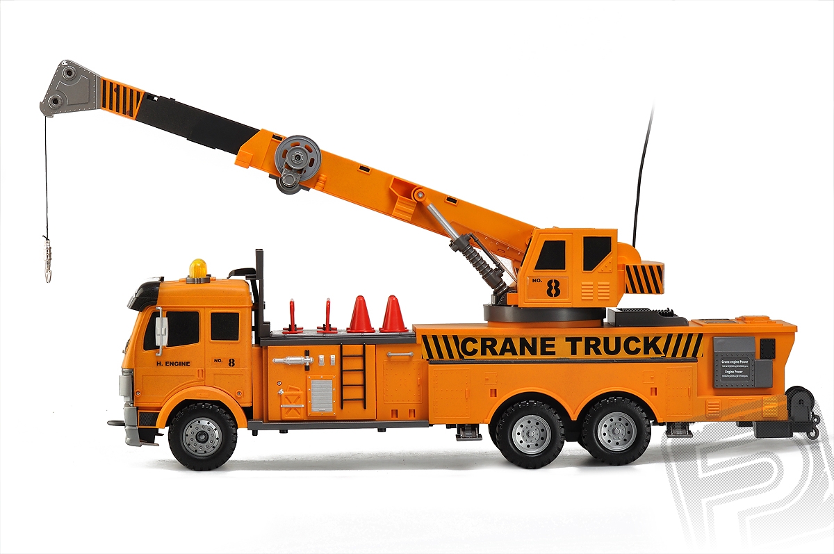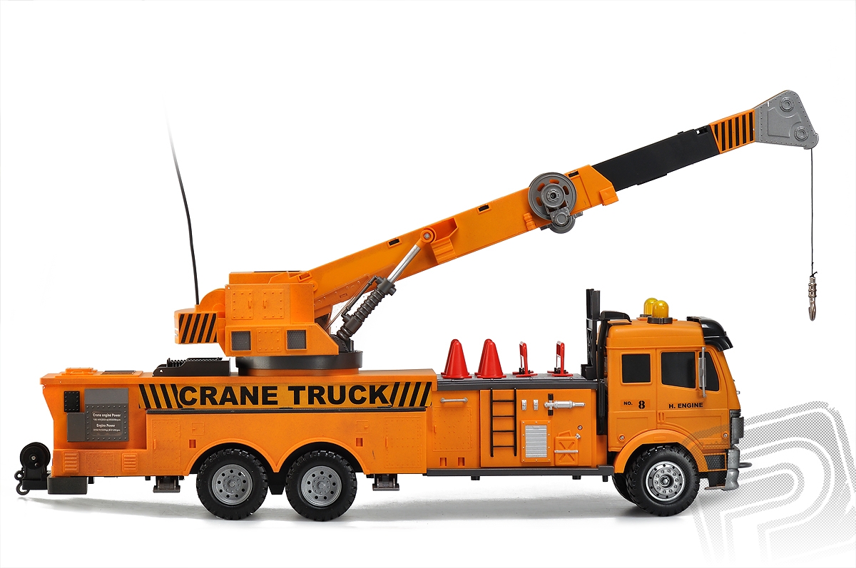 RC model Crane Truck - těžký autojeřáb s teleskopickým výsuvným ramenem v měřítku 1:18 s elektrickým pohonem věrně provádí většinu funkcí skutečného stroje. Je vybaven realistickým třínápravovým podvozkem, umožňujícím jízdu vpřed i vzad, zatáčení vlevo a vpravo při jízdě vpřed i vzad. Plně funkční je samozřejmě vlastní jeřáb - je umístěn na otáčivé plošině, jeho rameno se zvedá a spouští, vysunuje a zasunuje. Samozřejmě, navíjí a odvíjí se i lano jeřábu s hákem. Pro práci na noční směně a za nepříznivého počasí je autojeřáb vybaven funkčními světly. Dva páry opěr po stranách autojeřábu zvyšující stabilitu při manipulaci s nákladem se vysouvají a zasouvají ručně.