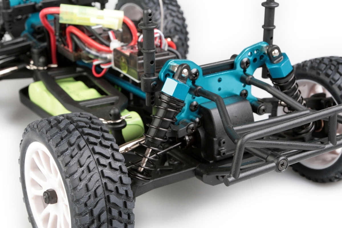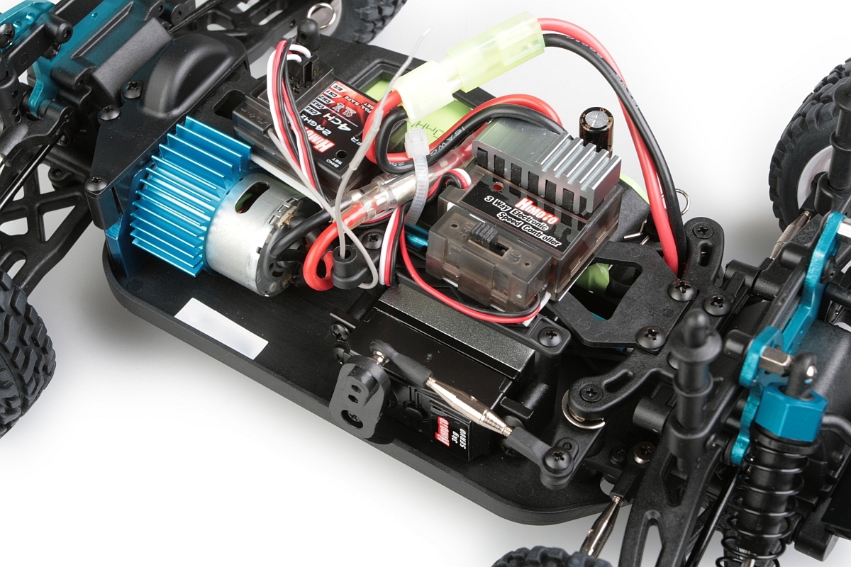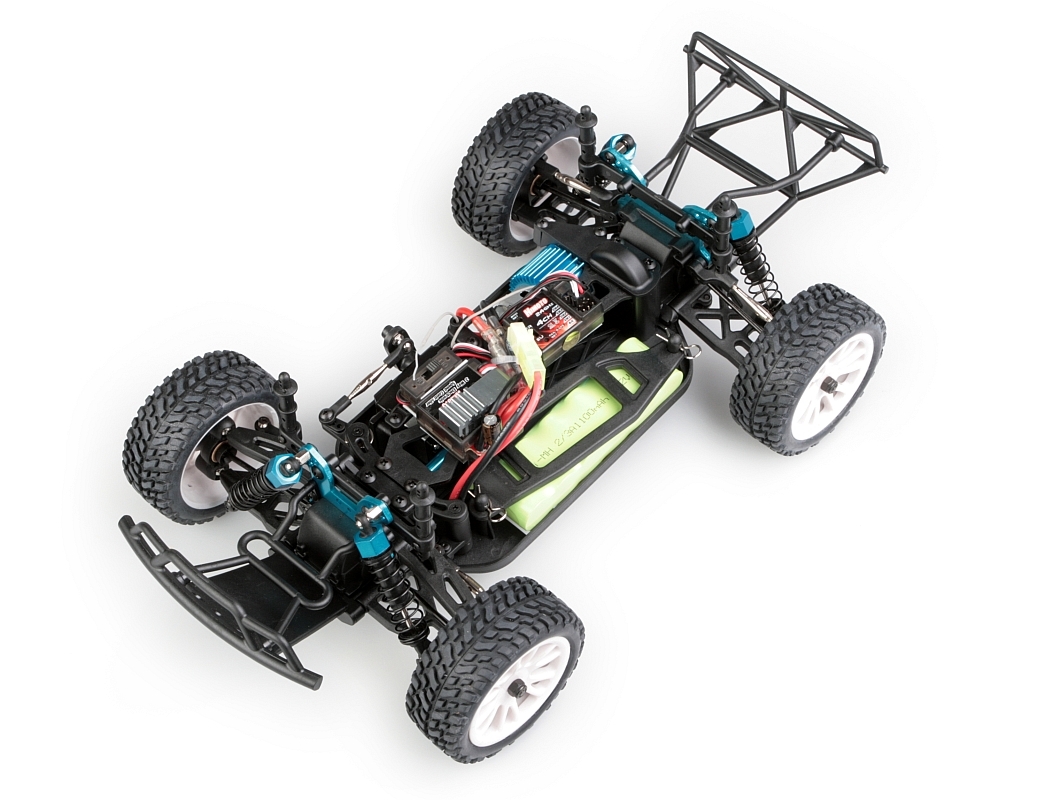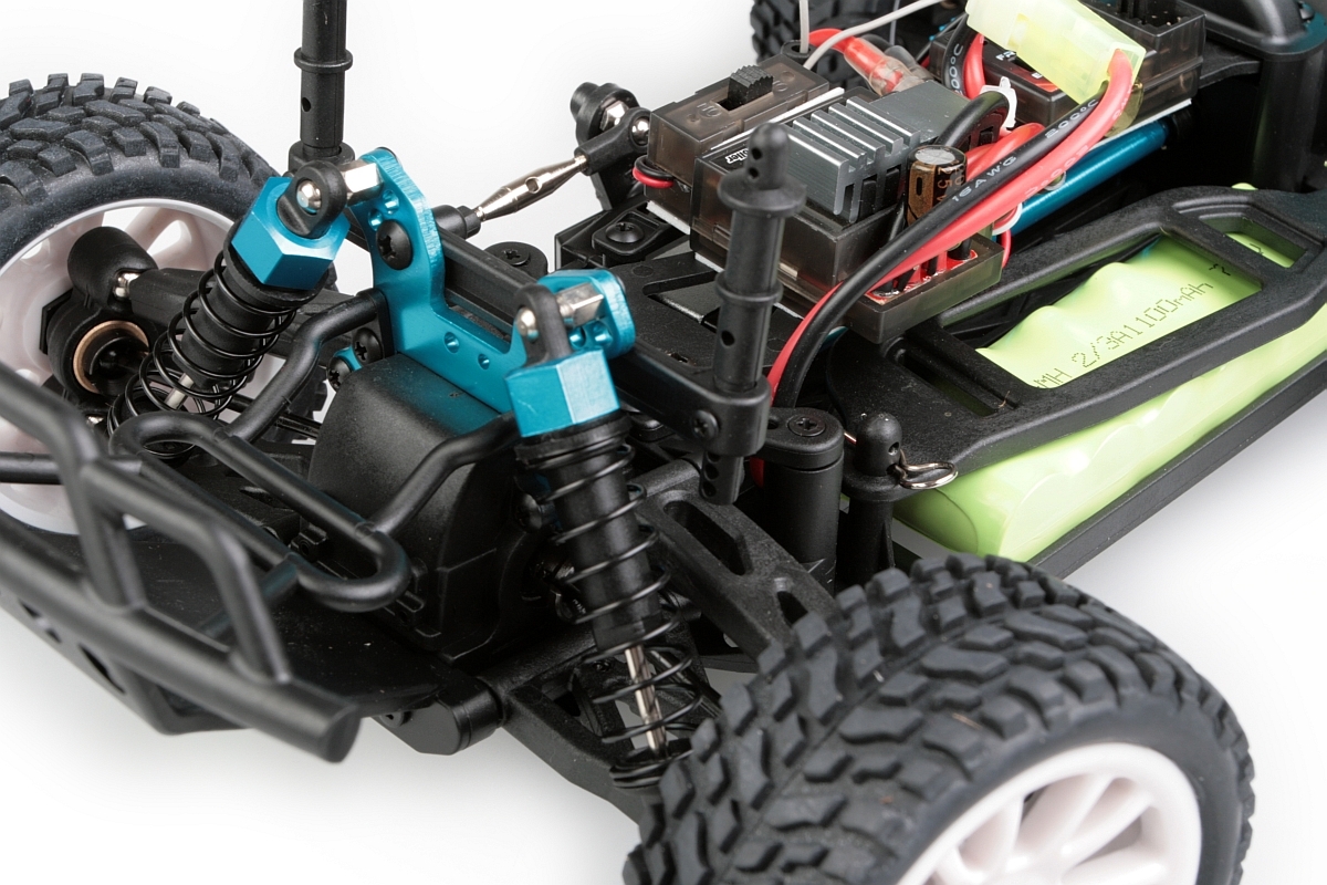 Konstrukce podvozku je převážně plastová, ale na exponovaných místech, jako jsou poloosy, držáky tlumičů, spojovací tyče apod. je použit kov. K pohonu je použit stejnosměrným motorem velikosti "380", který přes stálý převod a diferenciály pohání všechna čtyři kola. Ty jsou nezávisle zavěšena a odpružena olejovými tlumiči s vinutými pružinami. Spojovací tyče jsou vybaveny pravo/levým závitem, což umožňuje nastavení geometrie podvozku, což není u této velikosti zcela běžné. Motor vybavený chladičem je ovládán stejnosměrným obousměrným regulátorem otáček. Ovládání zajišťuje dvoukanálová, volantová RC souprava pracující v pásmu 2,4Ghz.