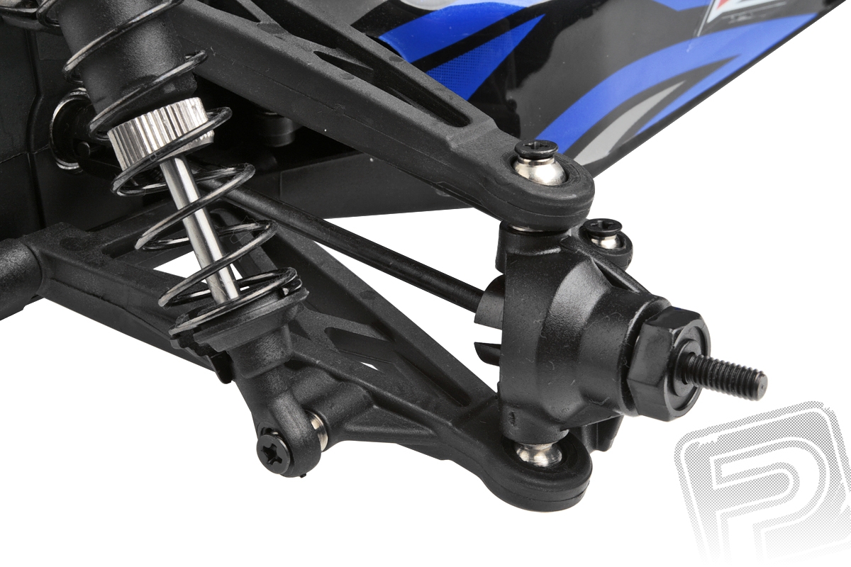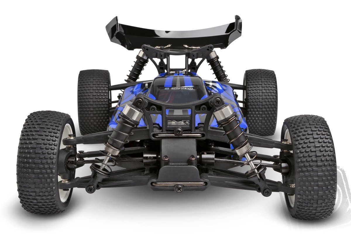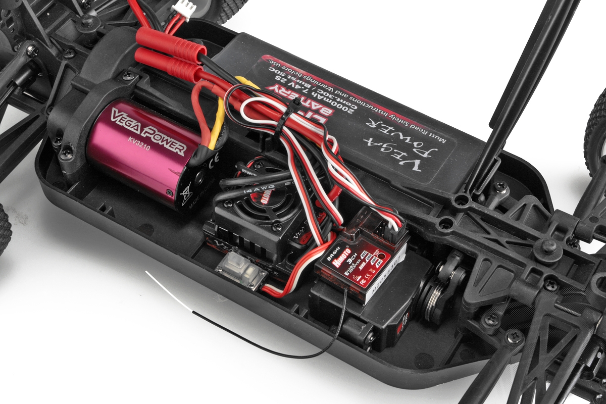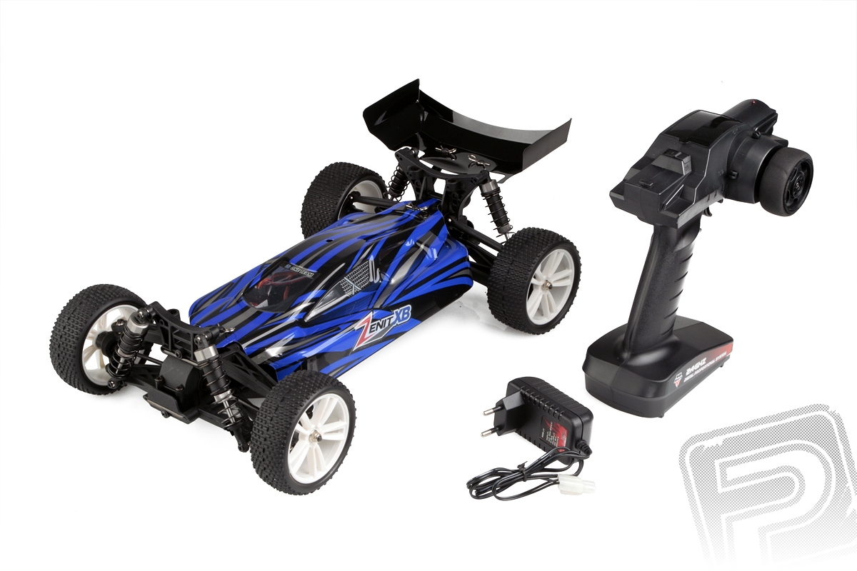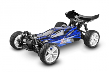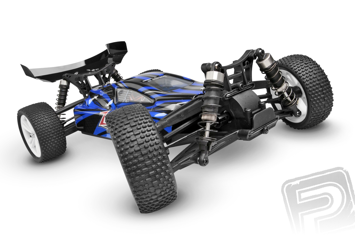 Kompletně sestavený model buggy s pohonem střídavým motorem. Součástí je RC souprava 2,4 GHz a pohonná baterie. Model připraven k jízdě.