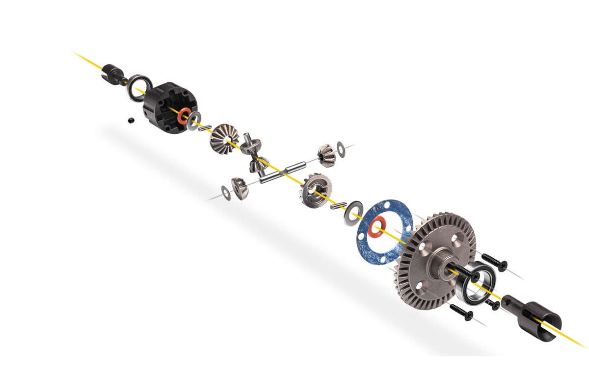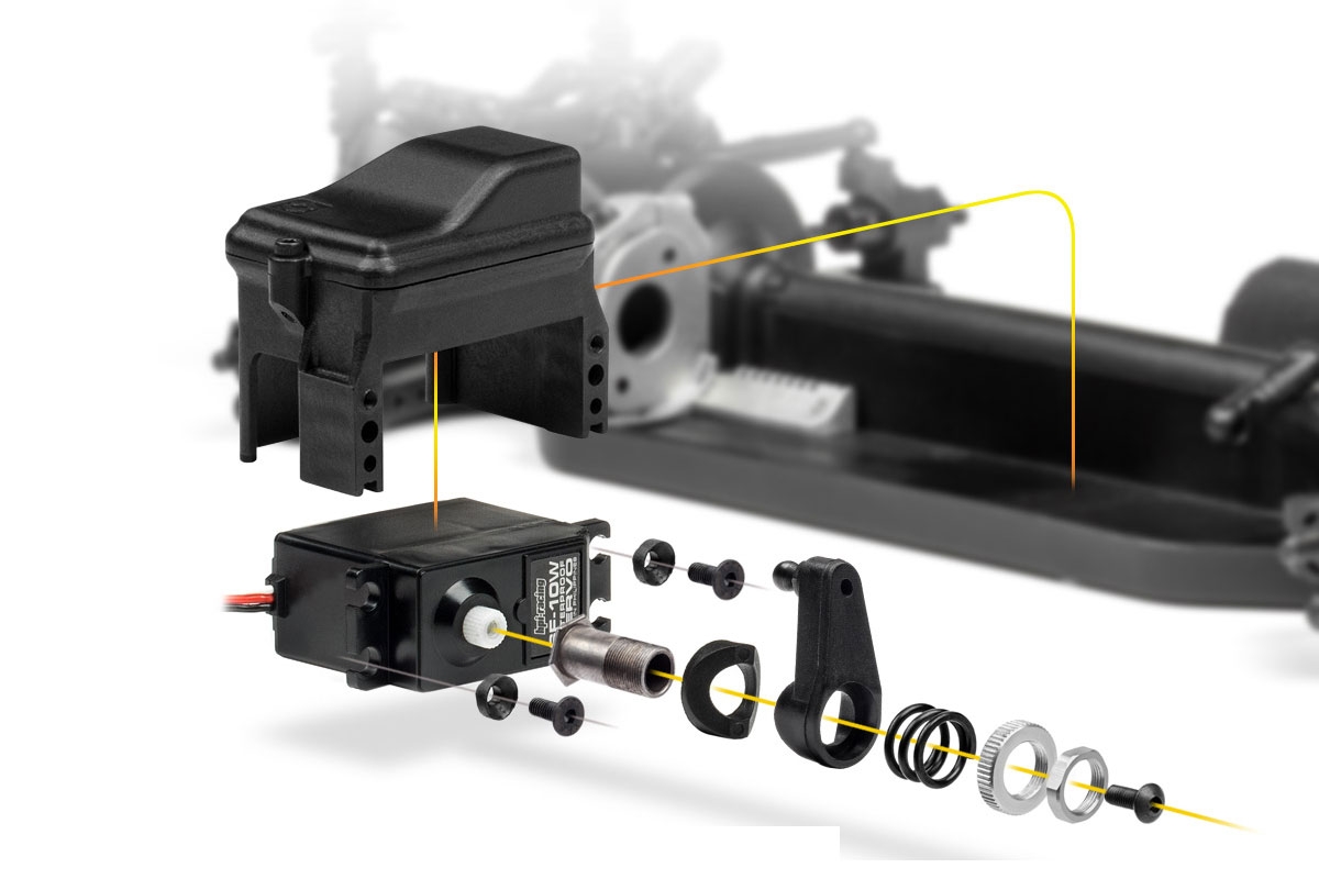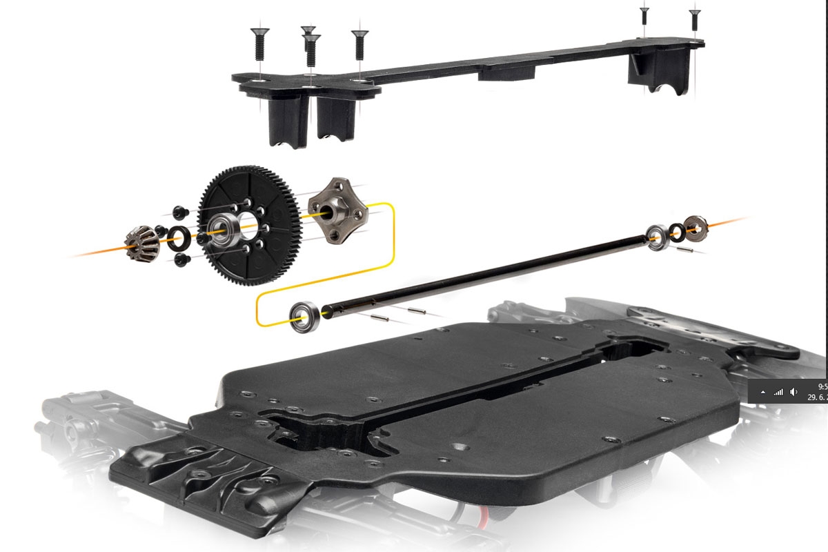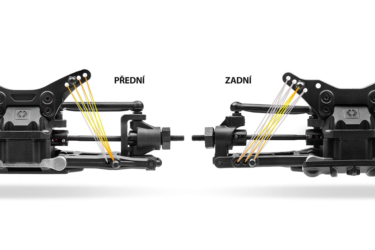 Model dále obsahuje plně stavitelné olejové tlumiče, servo saver, kovový držák motoru či zadní difuzor pro dokonalé proudění vzduchu. Všechna ložiska jsou kuličková. Ochranu podvozku před nárazy zajišťuje také pevný pěnový nárazník.