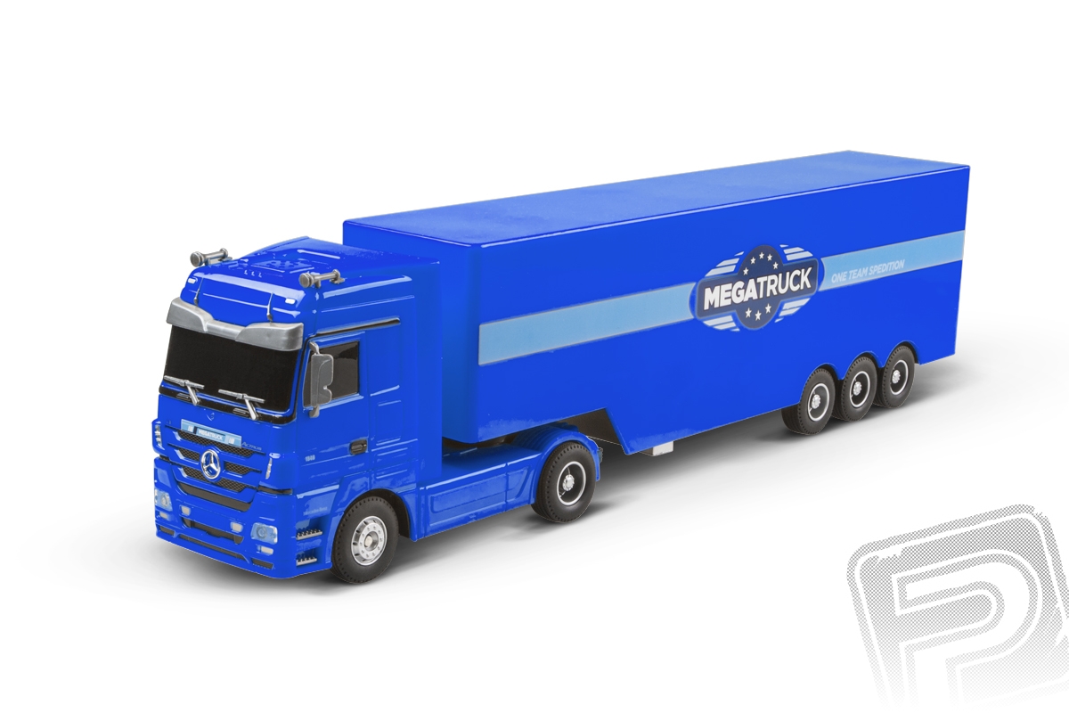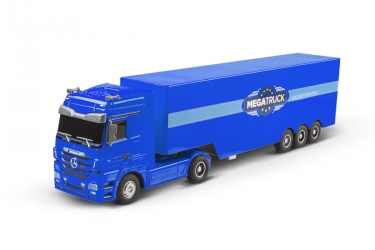 Náš Mega Truck Mercedes-Benz Actros v měřítku 1:32 je poháněn stejnosměrným motorem s pohonem zadní nápravy tahače a je ovládán pistolovou RC soupravou na frekvenci 27 MHz. Řízení modelu je neproporcionální.
