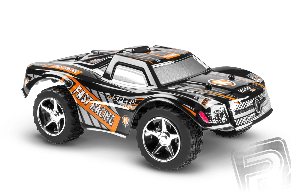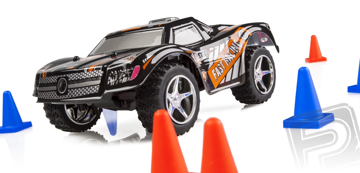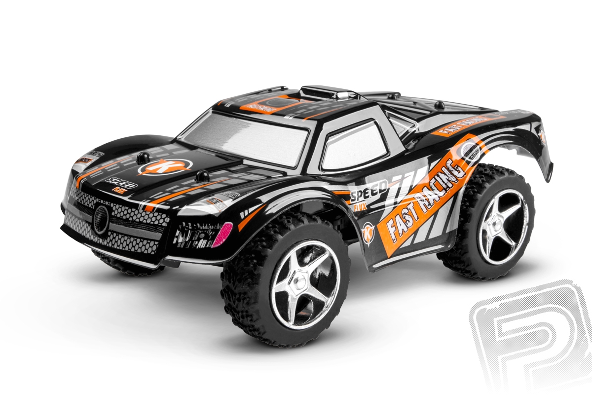 Miniaturní Truck RTR v měřítku 1:43 poháněný stejnosměrným motorem s pohonem zadní nápravy a pistolovou RC soupravou 2,4 GHz vč. LiPo pohonné baterie.