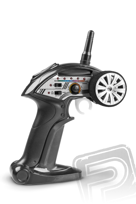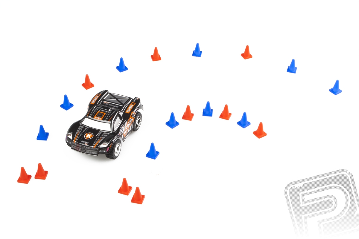Součástí setu je kompletně sestavený model v měřítku 1:43 připravený k jízdě vč. pohonného LiPo akumulátoru 3,7V, pistolovou RC soupravu 2,4 GHz a malé kužely pro vytýčení dráhy.