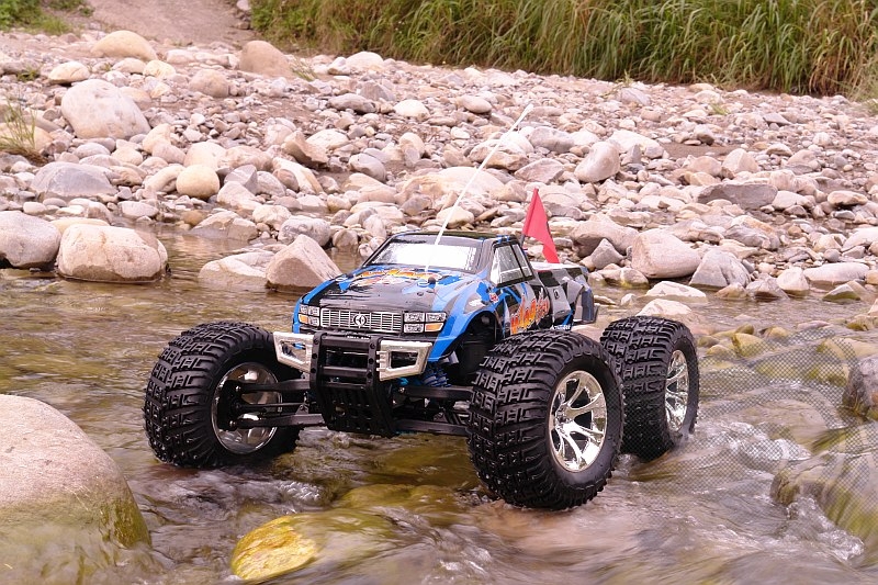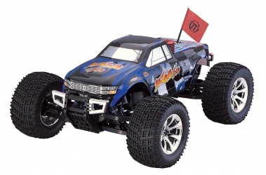 Silný a rychlý monster truck 1:8 4WD s motorem (8,2ccm) s roto startérem, dvoustupňovou převodovkou a zpátečkou. Smontovaný RTR model. Karoserie oranžová.
