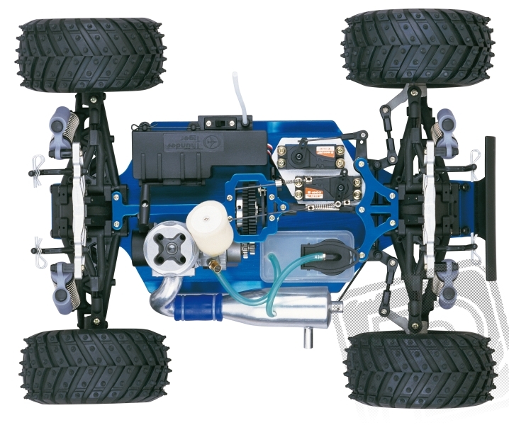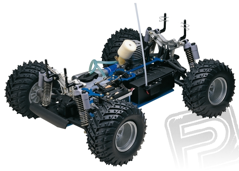 Základem podvozku je šasi z modře eloxovaného duralu. Ze stejného materiálu je i horní výztuha zajišťující dostatečnou tuhost. Výkon od motoru je přenášen přes odstředivou spojku a dvoustupňovou převodovku na všechna čtaři kola. Poloosy jsou ocelové a podvozek je kompletně osazen kuličkovými ložisky. Kola jsou nezávisle zavěšena na lichoběžníkových ramenech z pevného plastu plněného skelným vláknem. O odpružení se stará čtveřice olejových tlumičů s vinutými pružinami. Rozměrný RC box poskytuje dostatek místa pro uložení přijímače i baterie. Karosérie je nalakovaná včetně polepů.