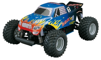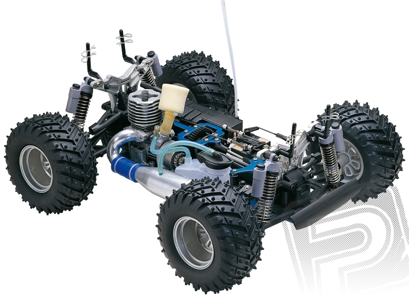 RC monster truck 1:10 4WD s motorem PRO-18BX (3.0ccm) s tahovým startérem a dvoustupňovou převodovkou. RTR komplet s dvoukanálovou pistolovou RC soupravou.