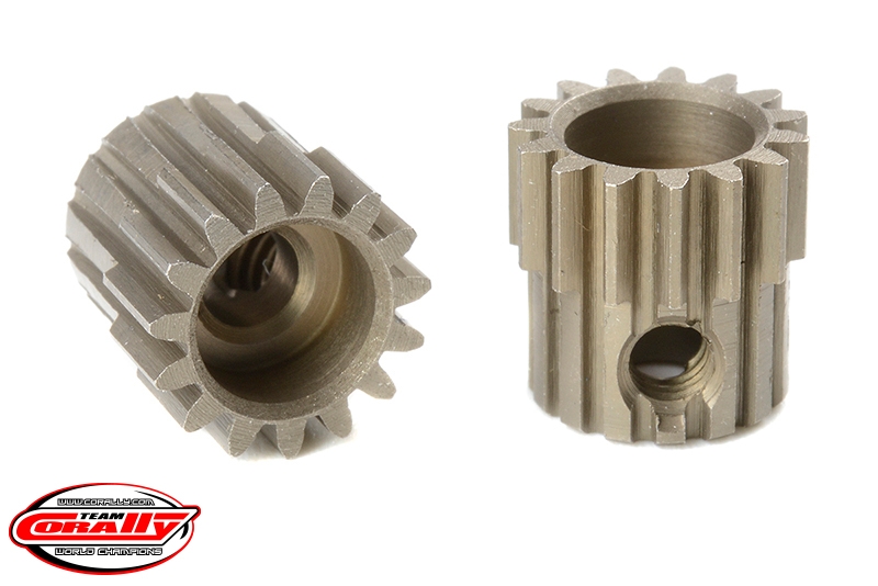 Krátké provedení, materiál tvrzená ocel, 15 zubů, modul ozubení 48DP. Pro hřídel motoru o průměru 3.17 mm (1/8 in). Pastorky TEAM CORALLY jsou vyráběny frézováním a následně tvrzeny, čímž je zajištěna vysoká přesnost ozubení. Všechny pastorky TEAM CORALLY jsou vyrobeny v EU.