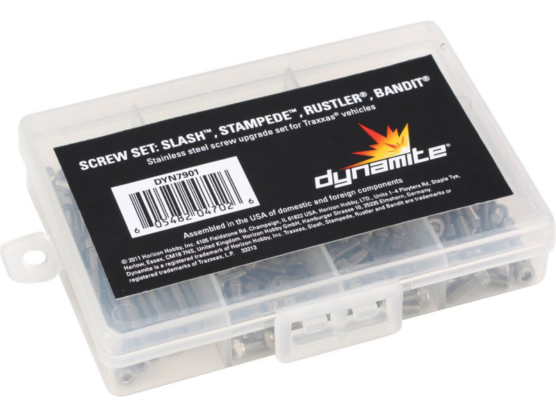 Dynamite sada nerezových šroubů, matic a podložek pro 2WD RC modely aut Traxxas Slash, Stampede, Rustler, Bandit. Dodává se v plastové krabičce, celkem 177 kusů.