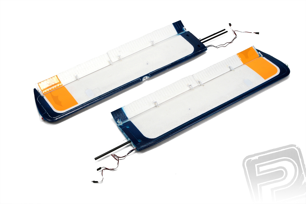 Křídlo rovněž z pěnového EPO s polosouměrným profilem je dvoudílné, spojované třemi trubkovými uhlíkovými spojkami a nasouvané z boku na trup. Na místě jsou zajištěna dvojicemi plastových zámků na spodní straně křídla. Křidélka typu Frise zavěšená na maketových vnějších závěsech jsou ovládána dvěma mikroservy uloženými v křídle s krátkými přímými drátovými táhly. Štěrbinové vztlakové klapky jsou ovládány jedním servem uloženým v kabině prostřednictvím drátových lanovodů. Plastové vzpěry křídla jsou k trupu a křídlu upevňovány šrouby.