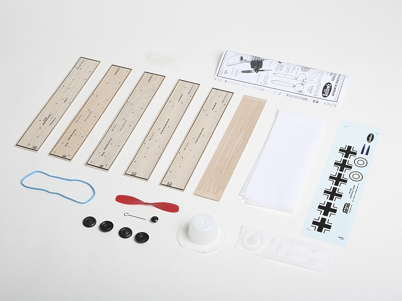 Minimaketa německého stíhacího letadla z II. sv. války s gumovým pohonem. Vysekávané díly, vrtule, gumový svazek a potah. materiál. Rozpětí 419 mm.