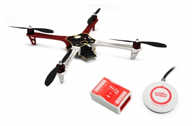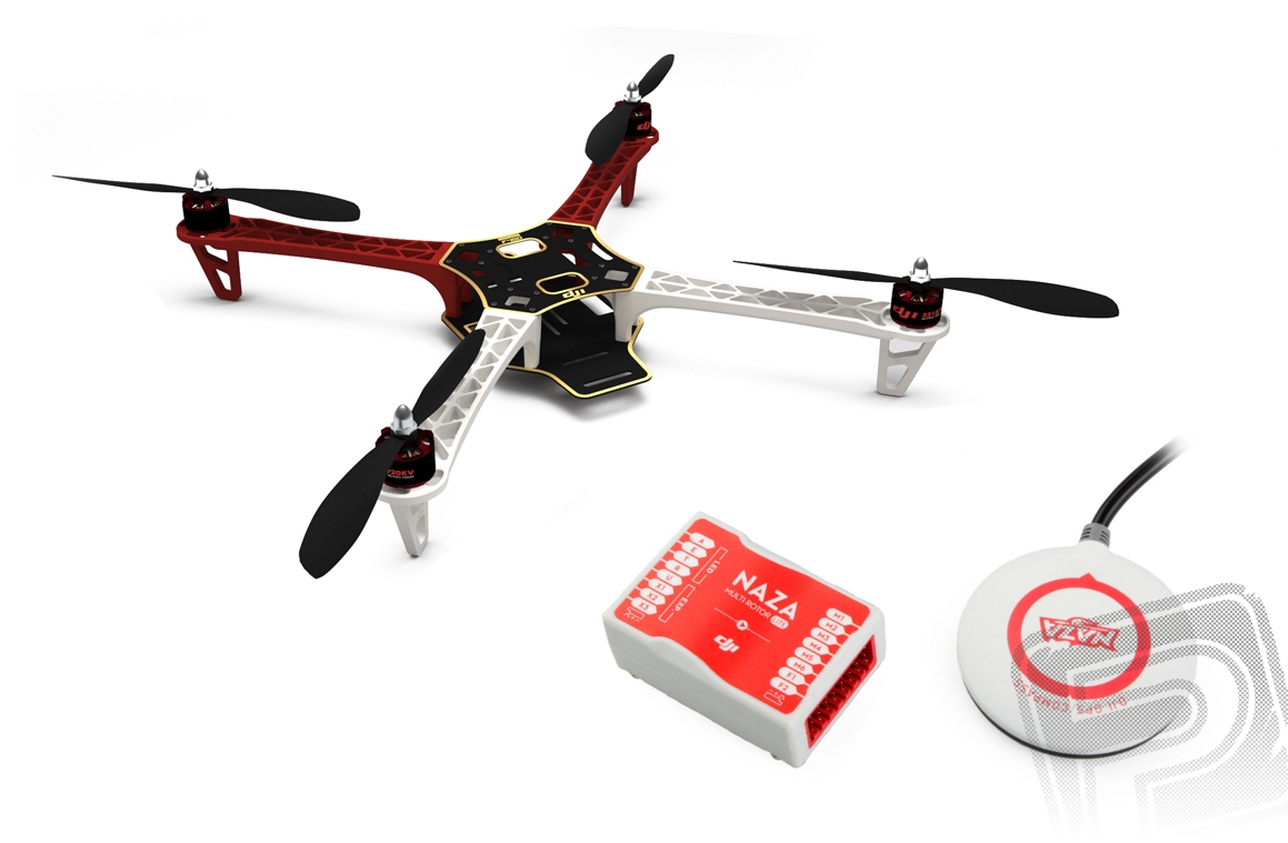 Sada obsahuje stavebnici DJI-F450 ARF (mechanika kvadrokoptéry se 4 střídavými motory C2312E/800 a 20A regulátory), modul autopilota NAZA-Lite včetně GPS/kompasu a podvozek.