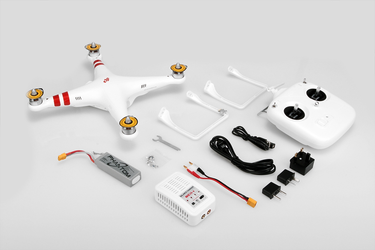 RC set obsahuje: hotový model, podvozek s modulem GPS/kompasu, vysílač 2,4 GHz, sadu 3 párů vrtulí, pohonný akumulátor LiPo 3S 11,1 V 2200 mAh, USB kabel a český návod (originální anglický návod a obslužný software je ke stažení na webových stránkách DJI).