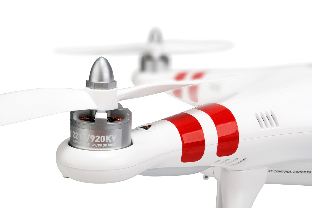 Pro ovládání modelu slouží šestikanálový vysílač 2,4GHz FHSS se dvěma křížovými ovladači pro řízení základních funkcí (pohyb nahoru/dolů, dopředu/dozadu, vlevo/vpravo a otáčení okolo svislé osy) a dvěma třípolohovými přepínači, kterými se volí letové režimy a režimy inteligentního řízení orientace modelu. Pro jeho napájení jsou zapotřebí čtyři tužkové alkalické baterie nebo NiMH akumulátory. Vysílač je dodáván v Módu 2, ale můžete jej velmi jednoduše "přestavět" na kterýkoliv z módů 1-4 přehozením aretační pružiny plynu a přepojením kabelů od ovladačů jednotlivých kanálů uvnitř vysílače. Počínaje verzí 3.5 vysílače, má i ovladač v ose plynu neutralizaci (tj. sám se vrací do středu) - v tomto provedení pro změnu módu stačí přepojení kabelů kanálů ve vysílači, žádná aretační pružina se nepřemísťuje.