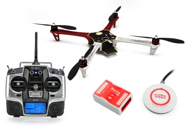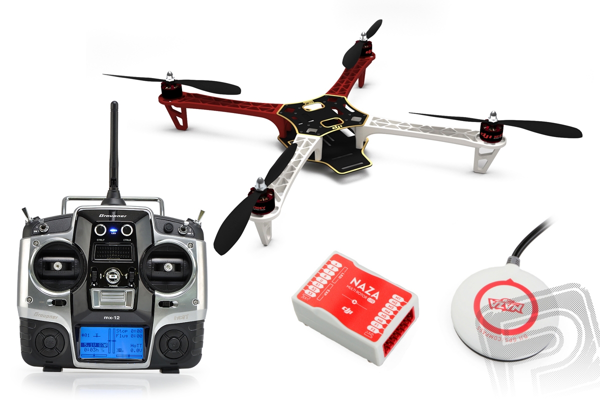 Sada obsahuje stavebnici DJI-F450 ARF (mechanika kvadrokoptéry se 4 střídavými motory C2312E/800 a 20A regulátory), RC soupravu Graupner MX-12 Hott a modul autopilotu NAZA-Lite včetně GPS/kompasu.