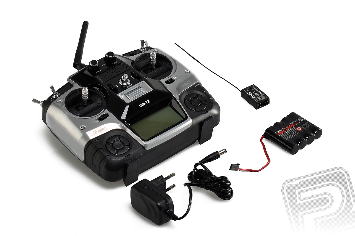 RC souprava MX-12: Vysílač s Tx aku 1500mAh, 1x přijímač Hott GR-12, nabíječ 220V/200mAh a český návod.