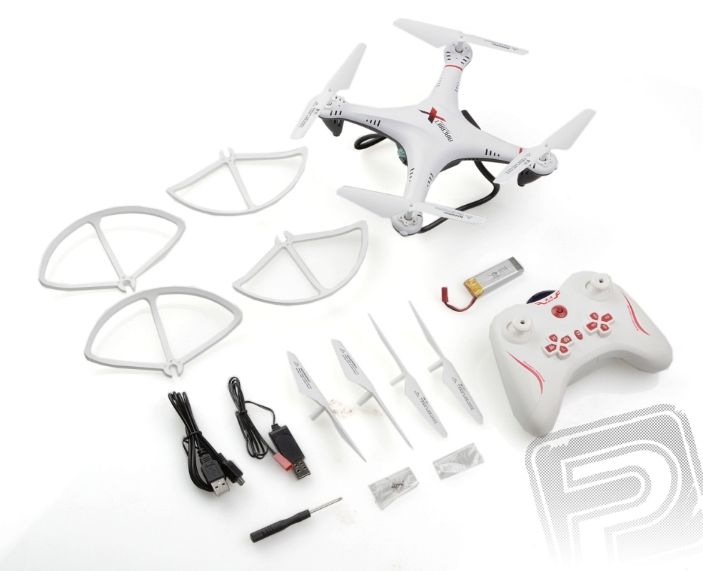 Malá kvadrokoptéra v MODU 2 s kamerou pro klidné poletování i akrobatické přemety s 2,4GHz vysílačem, LiPo akumulátorem a USB nabíječem.