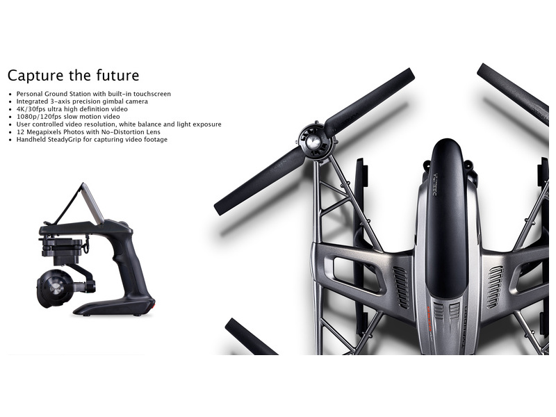 Poloprofesionální cenově dostupná kvadrokoptéra Yuneec Typhoon Q500 s nainstalovaným 3-osým stabilizovaným držákem kamery 4K, Full HD kamerou CGO3 4K/30fps ultra HD video. K řízení slouží 10-ti kanálová RC souprava ST10+ v pásmu 2,4 GHz s dotekovým 5,5" displejem, integrovaný přenos obrazu přes WiFi v pásmu 5 GHz z kamery na displej vysílače včetně telemetrických údajů. Vše co potřebujete, je obsahem balení.