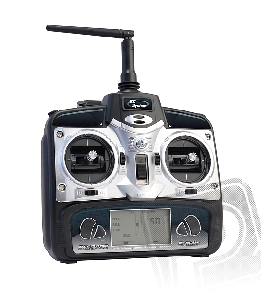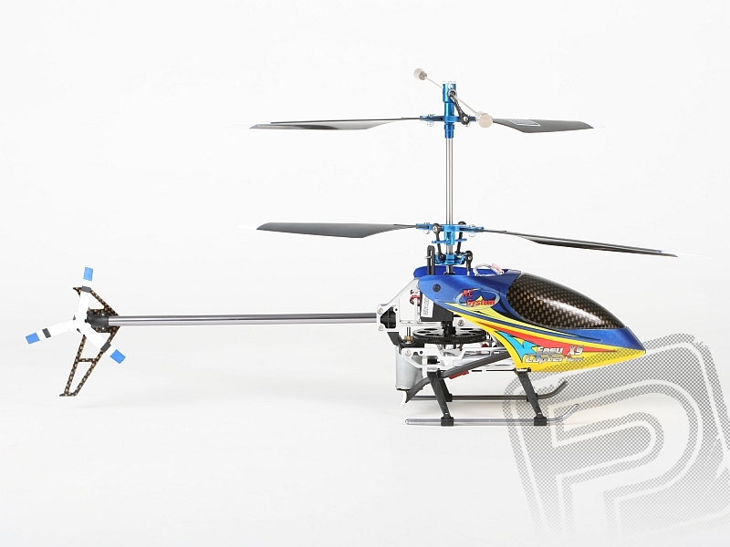 Pokojový mikrovrtulník s protiběžnými rotory se zjednodušeným ovládáním připravený k letu s tuningovou mechanikou a sportovní kabinou dodávaný s nabíječem, pohonným akumulátorem a čtyřkanálovým vysílačem 2,4 GHz LCD v módu 2 (plyn vlevo).