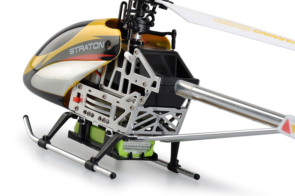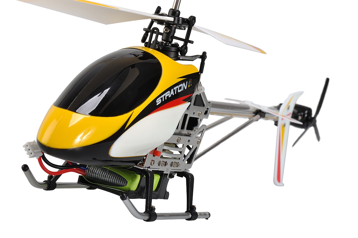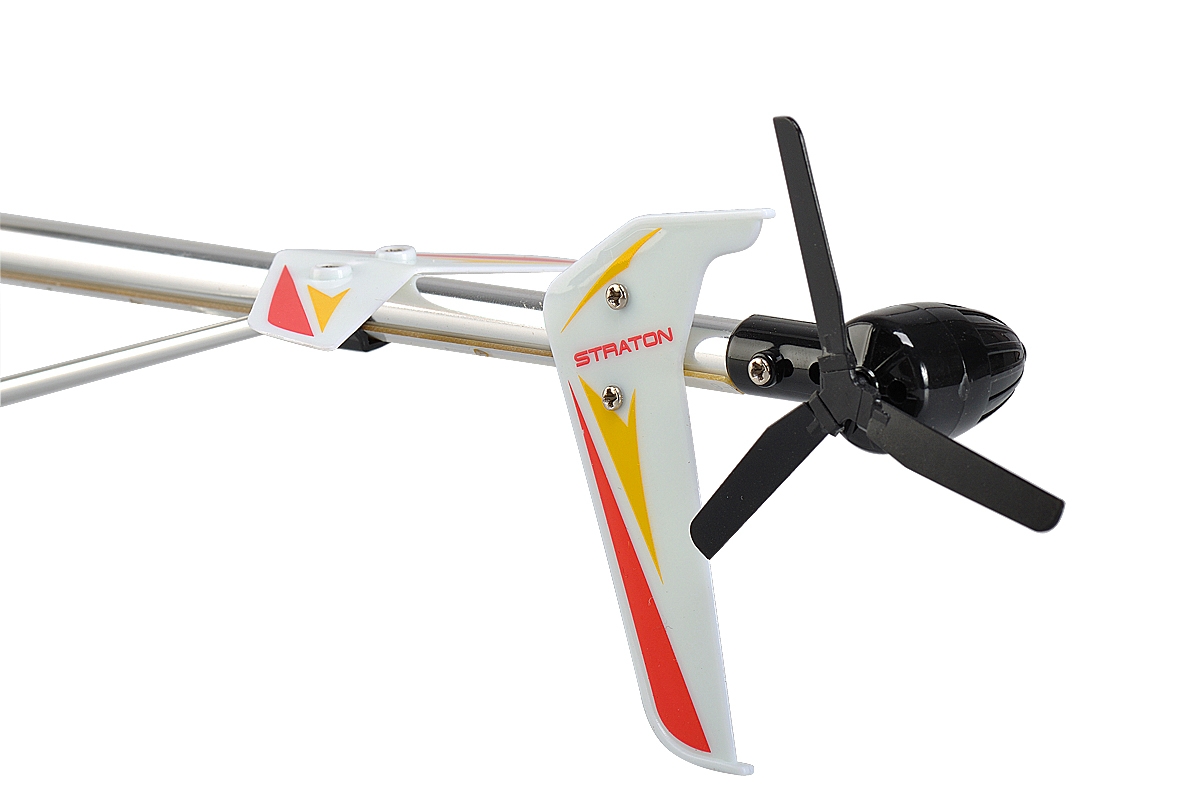 Velký dvourotorový vrtulník STRATON je klasické koncepce se dvěma souosými protiběžnými nosnými rotorem s pevným kolektivem se stabilizátorem Bell-Hiller spojeným s horním rotorem. Díky nosným rotorům o průměru 348 mm poháněným dvěma motory řady 250 napájeným z Li-poly dvoučlánku 850 mAh už to není žádný drobeček do obýváku. STRATON je vhodný pro létání ve velkých místnostech, tělocvičnách a halách, ale zalétáte si s ním bezpečně i venku za bezvětří nebo slabého vánku. STRATON bude hvězdou vlahých letních podvečerů, kdy se vítr utiší, a vy si budete vychutnávat létání s elegantním strojem v elegantním sportovním designu.